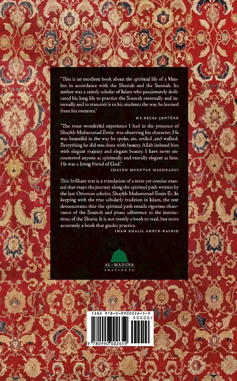 This is an excellent book about the spiritual life of a Muslim in accordance with the Shariah and the Sunnah. Its author was a saintly scholar of Islam who passionately dedicated his long life to practice the Sunnah externally and internally and to transmit it to his students the way he learned from his mentors. Dr. Recep entu rk The most wonderful experience I had in the presence of Shaykh Muhammad Emin was observing his character. He was beautiful in the way he spoke, ate, smiled ,and walked. Everything he did was done with beauty. Allah imbued him with elegant majesty and elegant beauty. I have never encountered anyone as spiritually and morally elegant as him. He was a living friend of God. Shaykh Mokhtar Maghraoui This brilliant text is a translation of a terse yet concise manual that maps the journey along the spiritual path written by the last Ottoman scholar, Shaykh Muhammad Emin Er. In keeping with the true scholarly tradition in Islam, the text demonstrates that the spiritual path entails rigorous observance of the Sunnah and pious adherence to the instructions of the Sharia. It is not merely a book to read, but more accurately a book that guides practice. - Imam Khalil Abdur-Rashid