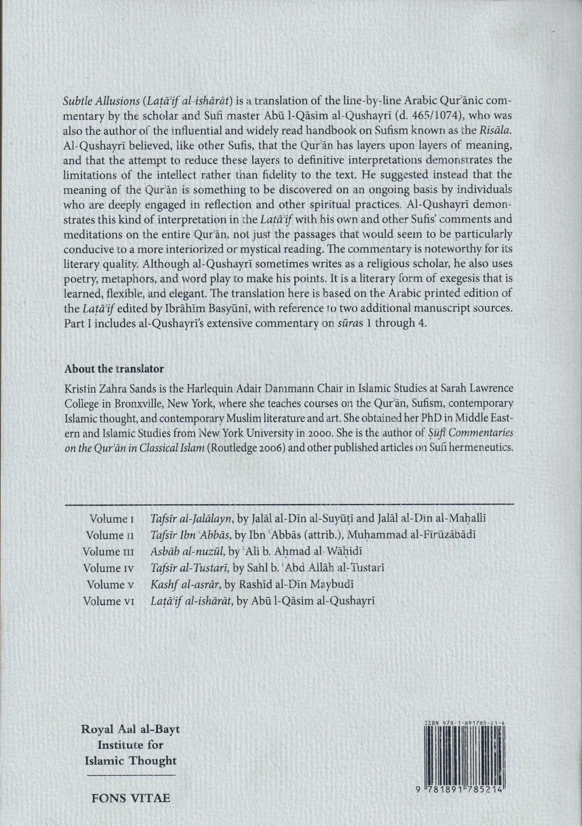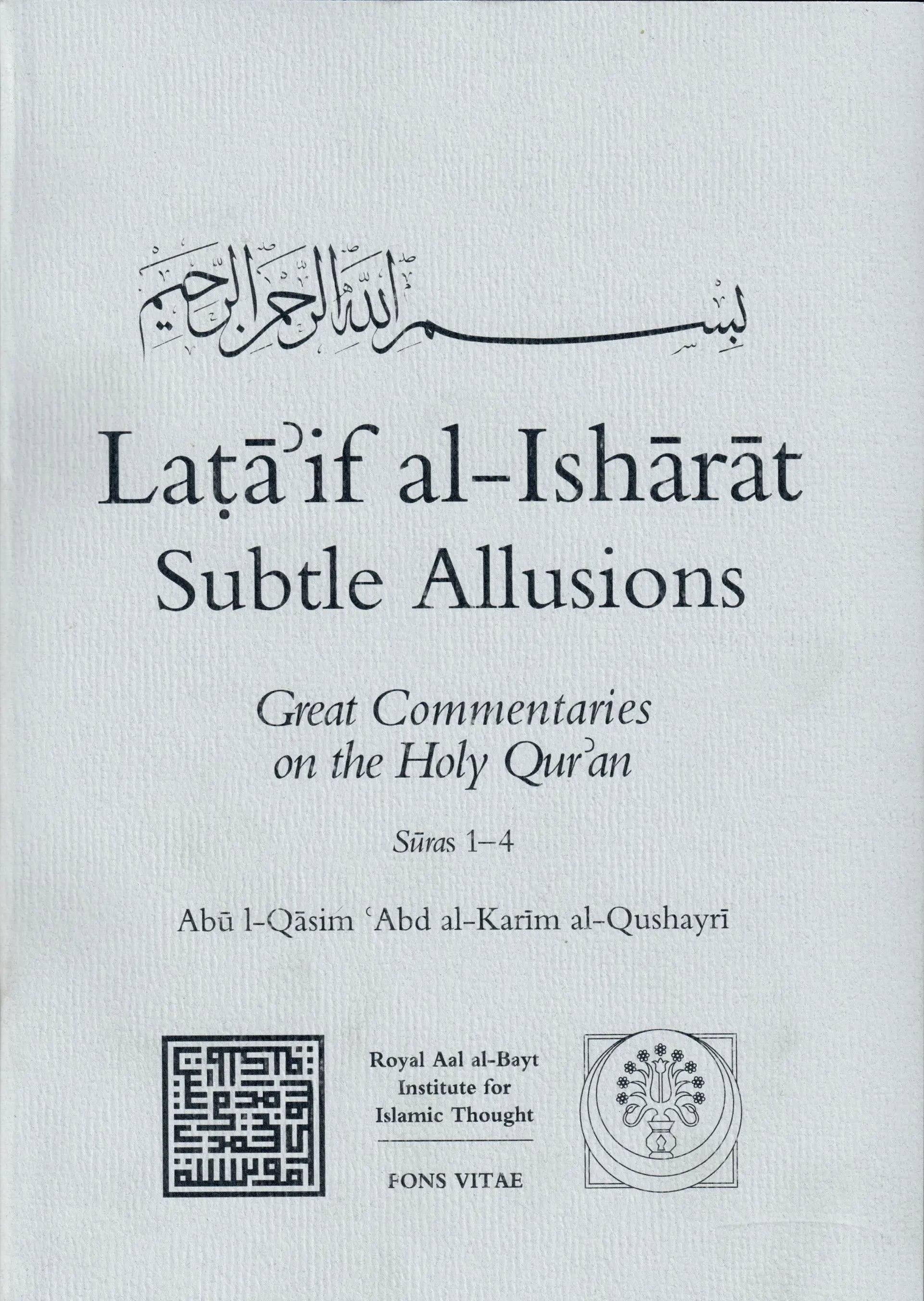 Subtle Allusions (Lataʾif al-isharat) is a line-by-line Arabic Qurʾanic commentary by the scholar and Sufi master Abu l-Qasim al-Qushayri (d.465/1074), who was also the author of the influential and widely read handbook on Sufism known as the Risala. Qushayri believed, like other Sufis, that the Qurʾan has layers upon layers of meaning, and that the attempt to reduce these layers to definitive interpretations demonstrates the limitations of the intellect rather than fidelity to the text.