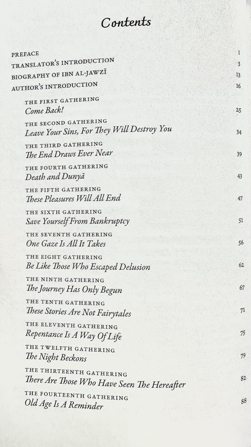 In an age where hearts are hardened and tears struggle to flow, this remarkable work of exhortation and advice by the Ḥanbalī polymath and gifted orator, Ibn al-Jawzī, should be read time and time again. Filled with heart-softening stories, emotive poetry, and forthright admonition at times, this work pushes a person to reconnect with their Creator before it is too late. The author was a renowned orator at whose hands many renewed their covenant to Islam, and the hope is that this translation into the English language will have the same effect on its readers.
