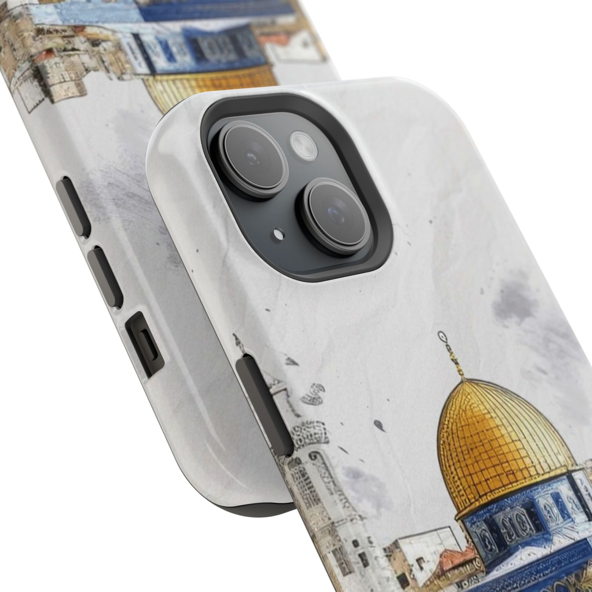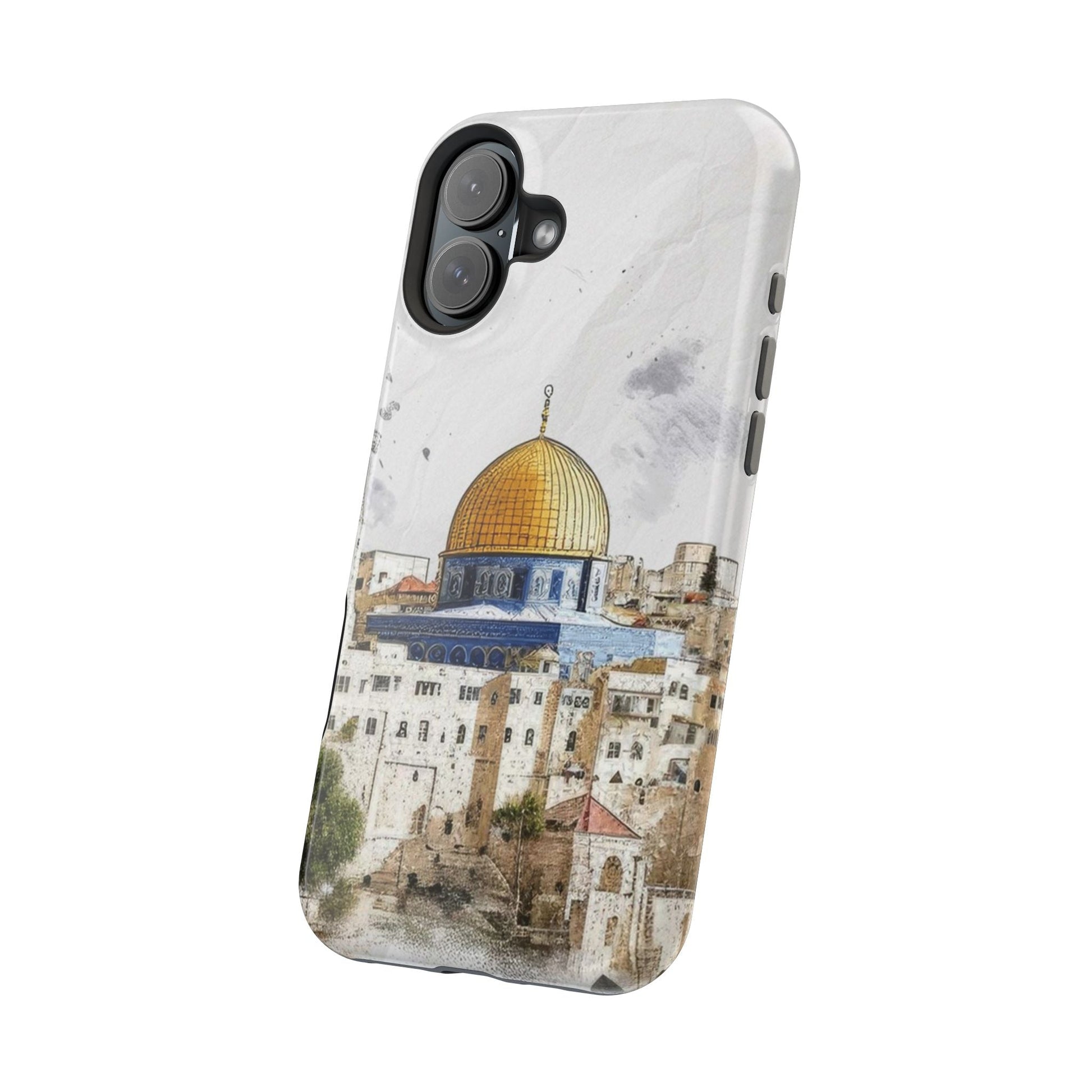 Jerusalem City magnetic phone case. Equipped with an outer polycarbonate shell and inner black TPU lining, this case delivers robust protection thanks to its durable, flexible, impact-resistant nature. Available in a matte or glossy finish, each case comes with an embedded magnet module that is compatible with MagSafe® accessories and a stunning print that fully wraps around your case's exterior.