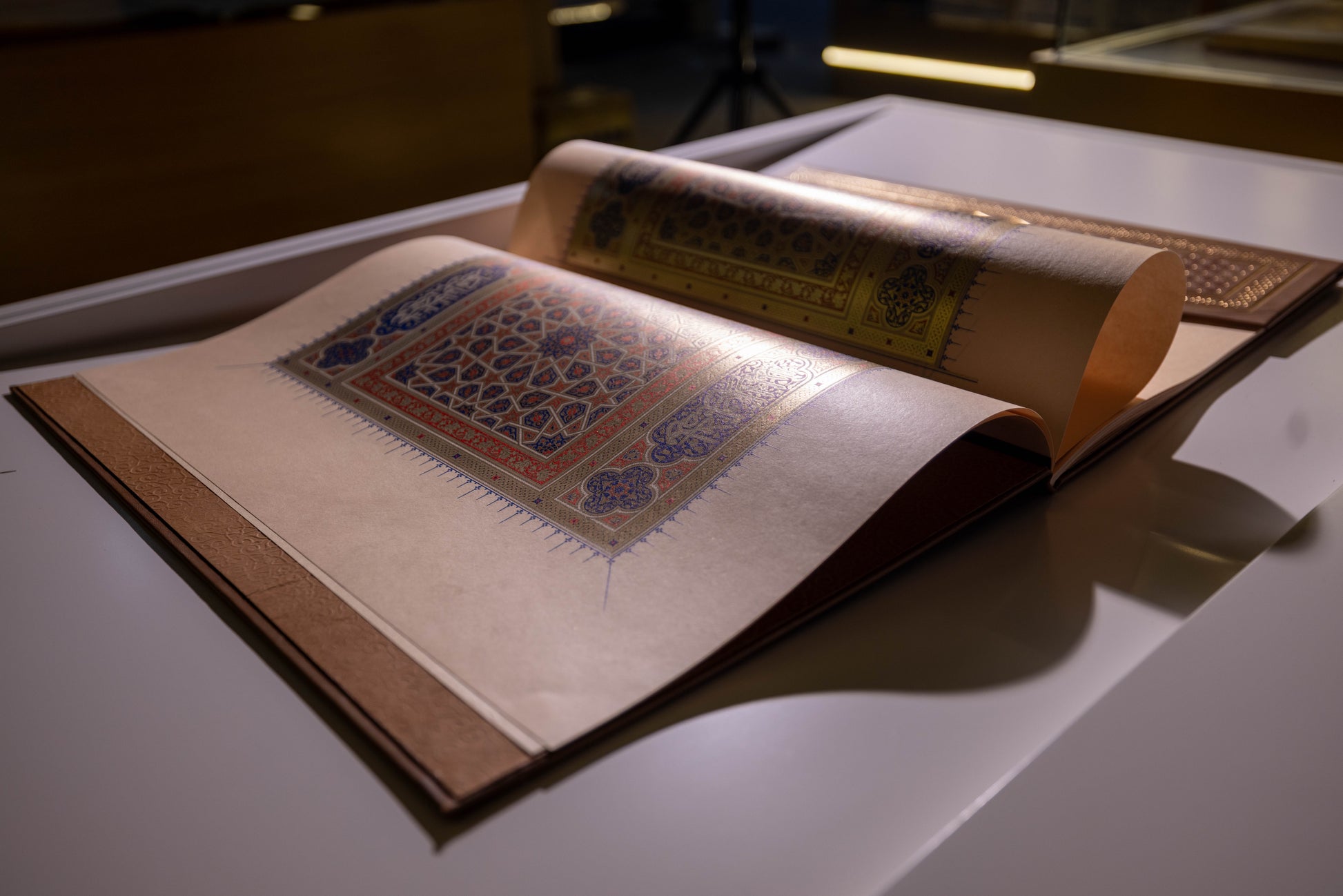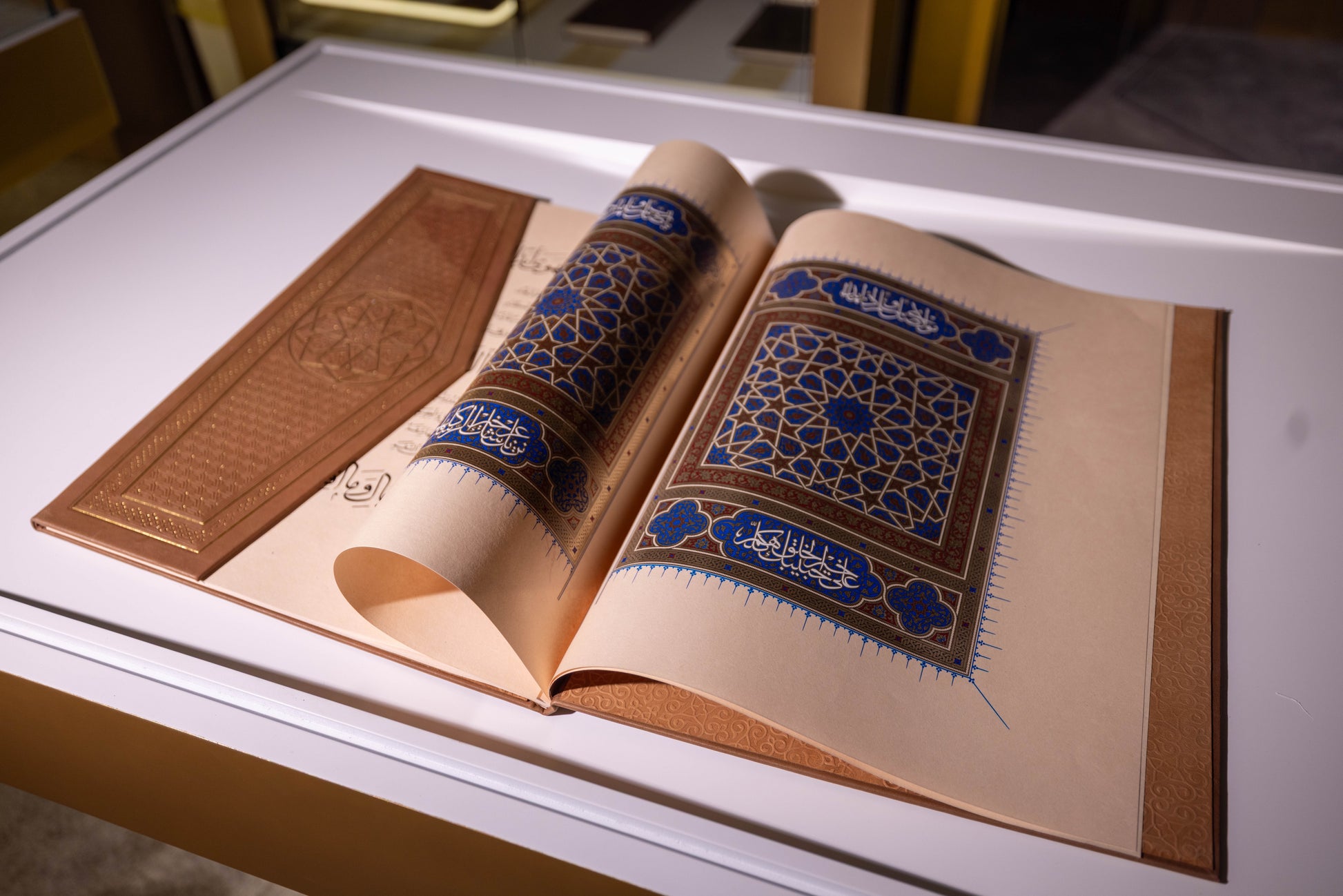 A museum-caliber calligraphic masterwork — handcrafted by eight master artisans across three countries, rendered in seven historic Arabic scripts with inks infused with real copper, silver, and gold, on custom handmade paper, bound in hand-tanned natural leather. Of the 100 copies produced worldwide, 98 have already been placed with collectors and institutions.