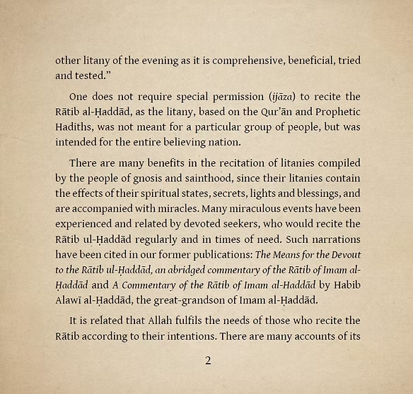The famous Rātib of Imam Abdallāh bin Alawī al-Ḥaddād is a litany with verses of the Qur’ān and Prophetic supplications. It was not meant for a particular group of people, but was intended for the entire believing nation.