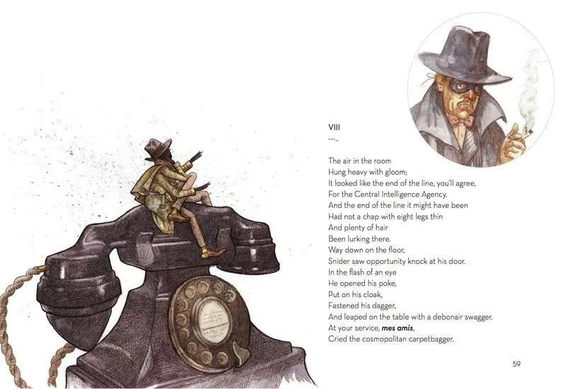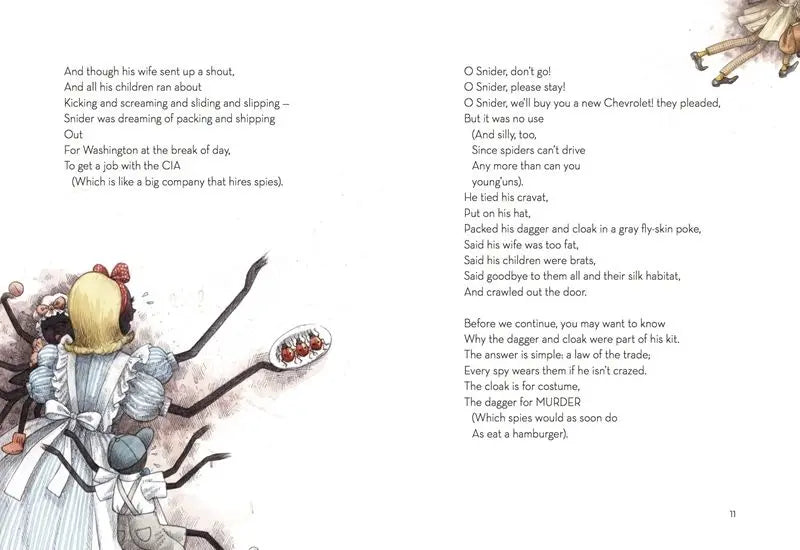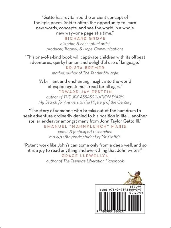 John Taylor Gatto's The Adventures of Snider, The CIA Spider is a fabulously funny epic poem about a spider who is a big thinker with a fantastic plan for his life: becoming a CIA spy! Our spider, Snider, leaves his wife Wanda and their 26 children on the Irrawaddy River, while he sets out on a banana peel boat headed to Washington D.C. in pursuit of his dream.