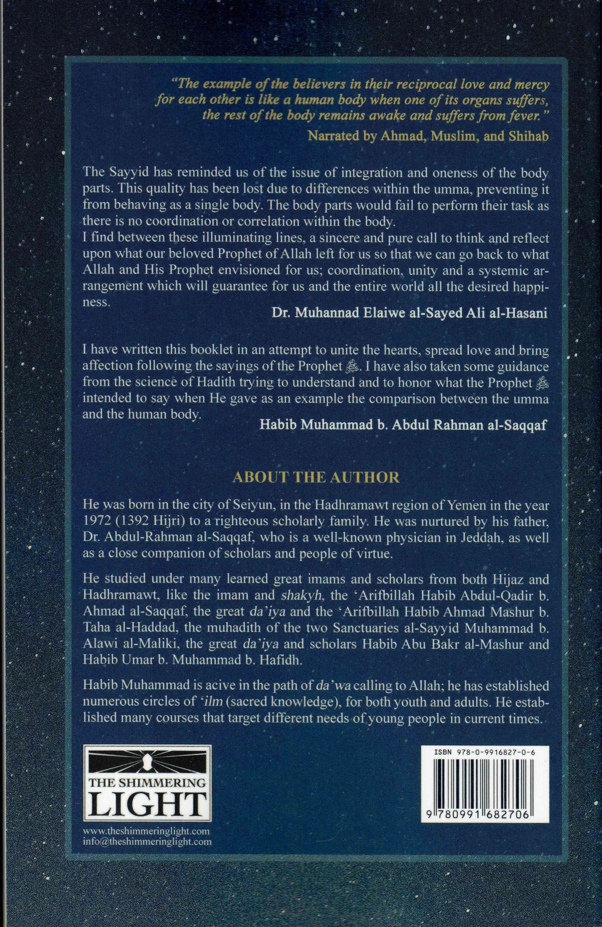 This work is an exposition of the Noble Hadith mentioned above. Habib Muhammad al-Saqqaf frames a way of thinking about the Umma, as set out in the Hadith, and links the 'parts' of the metaphorical body, such as the head, heart and hormones, to the functions of sections of the umma, thus drawing out a holistic view of the Umma of the Prophet (PBUH)