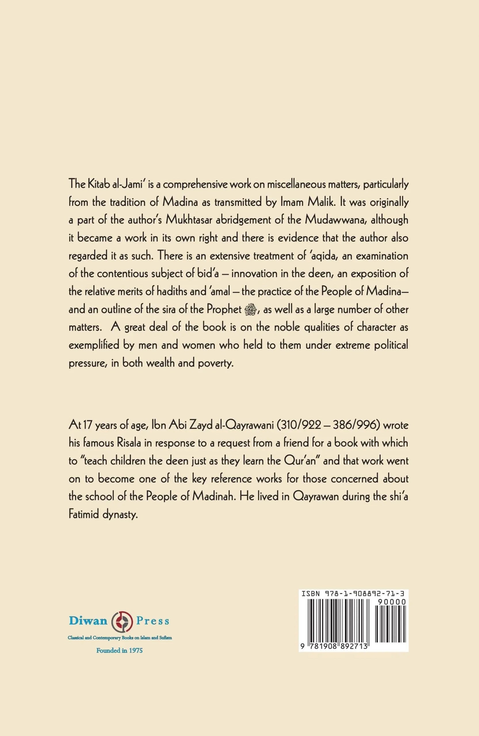 The Comprehensive Book (Kitab al-Jami‘) is a work on miscellaneous matters, particularly from the tradition of Madina as transmitted by Imam Malik. It was originally a part of the author’s Mukhtasar of the Mudawwana. There is an extensive treatment of ‘aqida, an examination of the contentious subject of bid’a – innovation in the deen, an exposition of the relative merits of hadiths and ‘amal – the practice of the People of Madina– and an outline of the sira of the Prophet, peace be upon him, as well as a large number of other matters. A great deal of the book is on the noble qualities of character as exemplified by men and women who held to them under extreme political pressure, in both wealth and poverty.