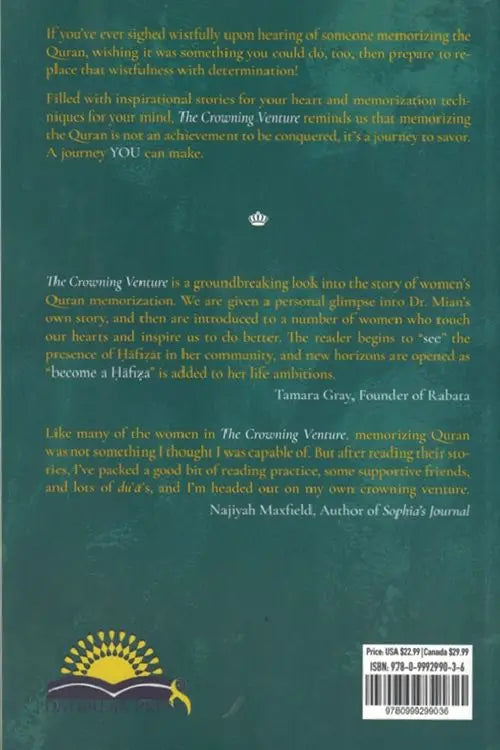 Filled with inspirational stories for your heart and memorization techniques for your mind, The Crowning Venture reminds us that memorizing the Quran is not an achievement to be conquered, it's a journey to savor. A journey YOU can make.