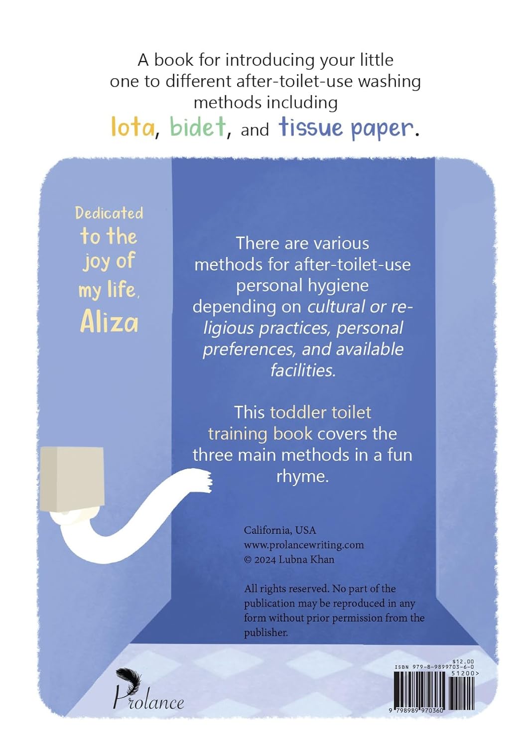A book for introducing your little one to different after-toilet-use washing methods including lota, bidet, and tissue paper. There are various methods for after-toilet-use personal hygiene depending on cultural or religious practices, personal preferences, and available facilities. This toddler toilet training book covers the three main methods in a fun rhyme.