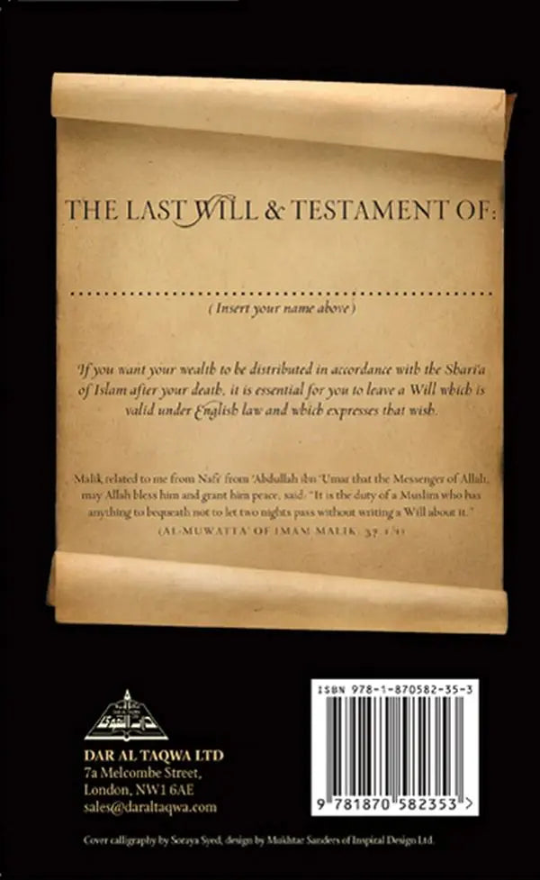 If you want your wealth to be distributed in accordance with the Shari'a of Islam after your death, it is essential for you to leave a will which is valid under English law and which express that wish. Malik relate to me from Nafi' from 'Abdullah ibn 'Umar that the Messenger of Allah, may Allah bless him and grant him peace, said: "It is the duty of a Muslim who has anything to bequeath not to let two nights pass without writing a will about it."