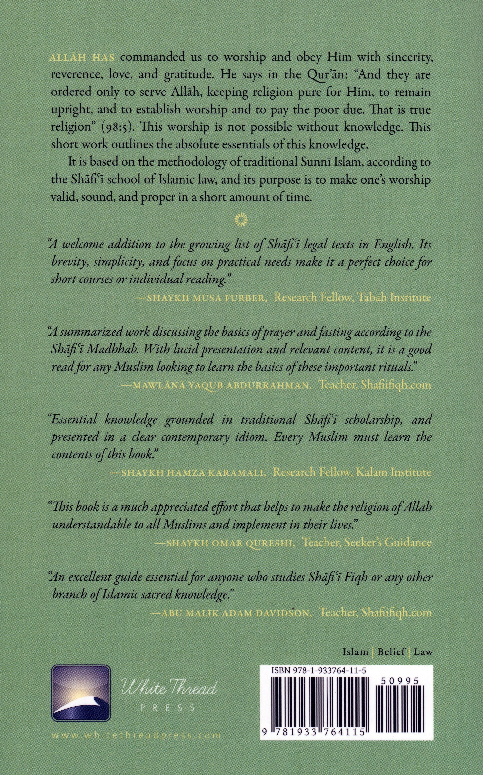 This worship is not possible without knowledge. This short work outlines the absolute essentials of this knowledge. It is based on the methodology of traditional Sunni Islam, according to the Shafi’i school of Islamic law, and its purpose is to make one’s worship valid, sound, and proper in a short amount of time.